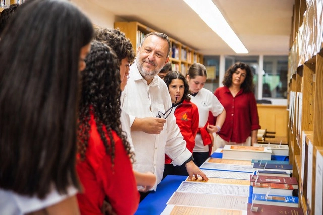 El 23 de abril, coincidiendo con el Día del Libro, el flujo constante de visitantes —194 alumnos y una decena de padres— transformó la biblioteca en un lugar de tránsito. No se trataba solo de observar libros antiguos o curiosos, sino de detenerse ante un legado que ha acompañado a la humanidad en sus preguntas más profundas. El 26 de abril, en torno a 50 padres acudieron nuevamente, prolongando esa experiencia de transmisión que trasciende lo meramente académico.