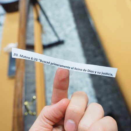 Al comenzar la velada los asistentes descubrieron que debajo de sus asientos se había pegado un papelito con la mitad del texto de una promesa bíblica, y la dinámica de oración consistió en ubicar a la persona que tenía la parte que completara el versículo para luego orar por la vida de esa persona.