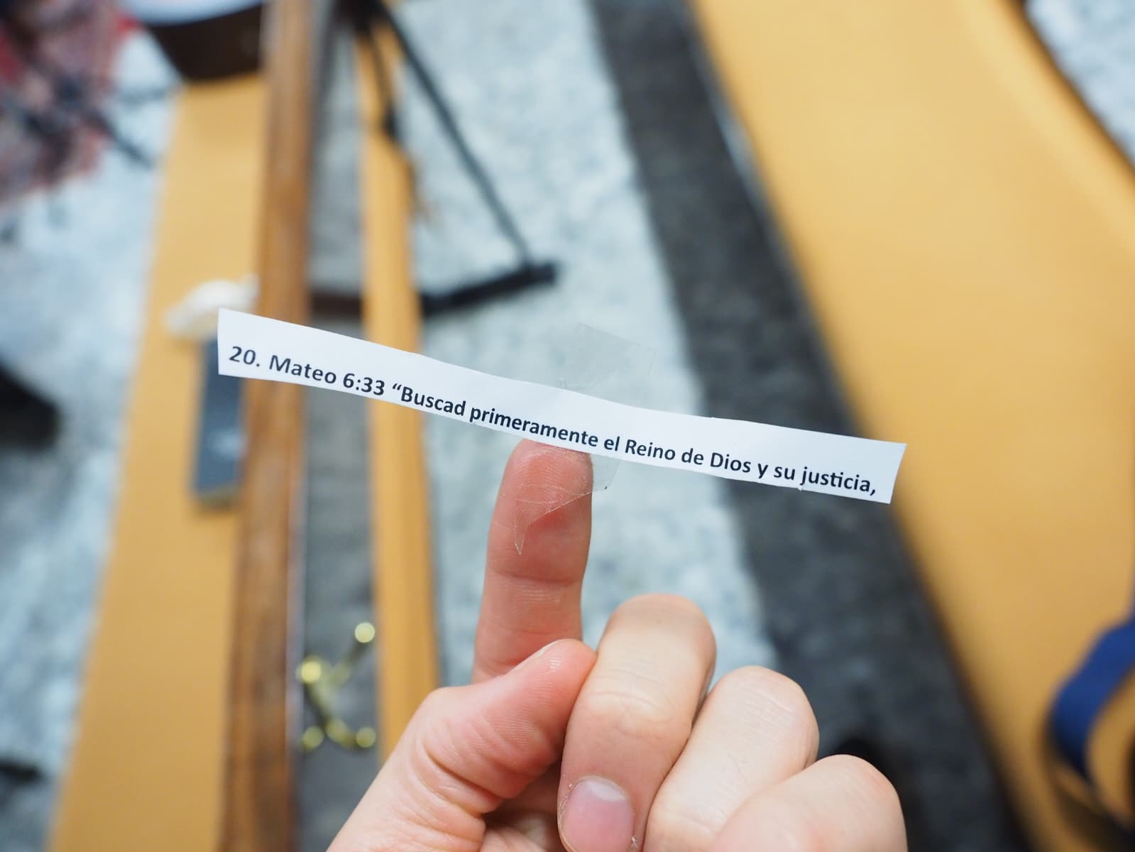 Al comenzar la velada los asistentes descubrieron que debajo de sus asientos se había pegado un papelito con la mitad del texto de una promesa bíblica, y la dinámica de oración consistió en ubicar a la persona que tenía la parte que completara el versículo para luego orar por la vida de esa persona.