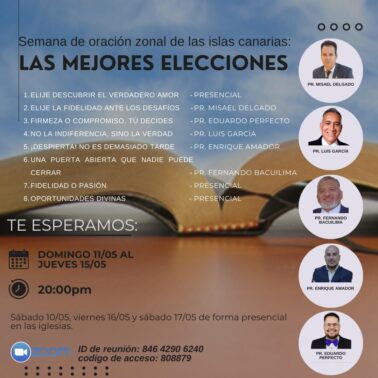 Del sábado 10 al sábado 17 de mayo, las iglesias de la zona de las Islas Canarias celebramos una semana de oración bendecida por el Señor. Esta iniciativa, organizada por los pastores de las islas, tuvo como título «Las mejores elecciones». Un enfoque profundamente espiritual basado en las siete iglesias del libro de Apocalipsis.